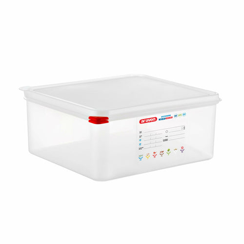Araven Food Storage Container, 14.7 qt., 13-7/8" x 12-3/4" x 6", GN 2/3 size, Colorclip® coded, capacity indicators, permanent label, dishwasher safe, polypropylene, transparent, includes airtight polyethylene lid, NSF, HACCP compliant