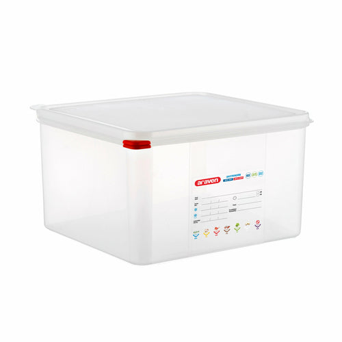 Araven Food Storage Container, 20 qt., 13-7/8" x 12-3/4" x 8", GN 2/3 size, Colorclip® coded, capacity indicators, permanent label, dishwasher safe, polypropylene, transparent, includes airtight polyethylene lid, NSF, HACCP compliant