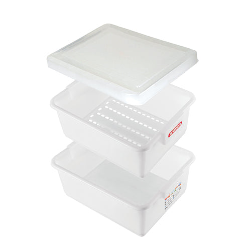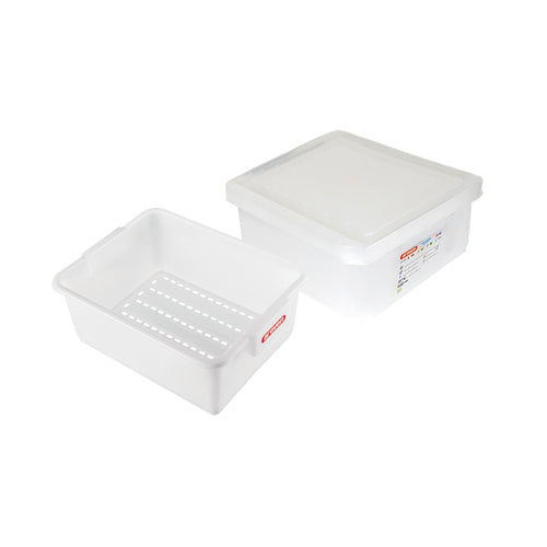Araven Defrost Kit, 37 qt., 20-7/8" x 15-5/8" x 8-7/8", 3-piece, includes: (1) holding box, (1) perforated bottom drip box, (1) lid, integrated label, temperature resistant 194°F to -40°F, dishwasher safe, high-density polyethylene, white, NSF