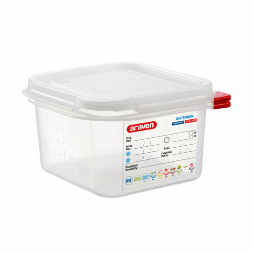 Araven Food Storage Container, 1.9 qt., 6-15/16" x 6-3/8" x 4", GN 1/6 size, Colorclip® coded, capacity indicators, permanent label, -40° F to 203° F temperature range, dishwasher safe, polypropylene, transparent, includes airtight polyethylene lid, NSF, HACCP compliant, BPA Free