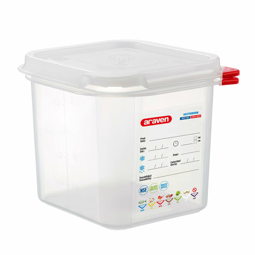 Araven Food Storage Container, 2.7 qt., 6-15/16" x 6-3/8" x 6", GN 1/6 size, Colorclip® coded, capacity indicators, permanent label, -40° F to 203° F temperature range, dishwasher safe, polypropylene, transparent, includes airtight polyethylene lid, NSF, HACCP compliant, BPA Free