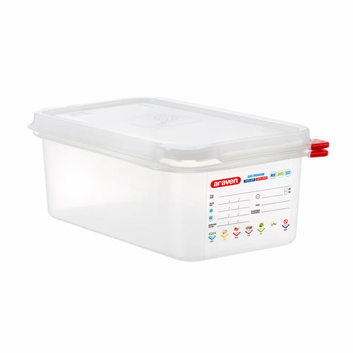 Araven Food Storage Container, 2.9 qt., 10-7/16" x 6-3/8" x 4", GN 1/4 size, Colorclip® coded, capacity indicators, permanent label, -40° F to 203° F temperature range, dishwasher safe, polypropylene, transparent, includes airtight polyethylene lid, NSF, HACCP compliant, BPA Free