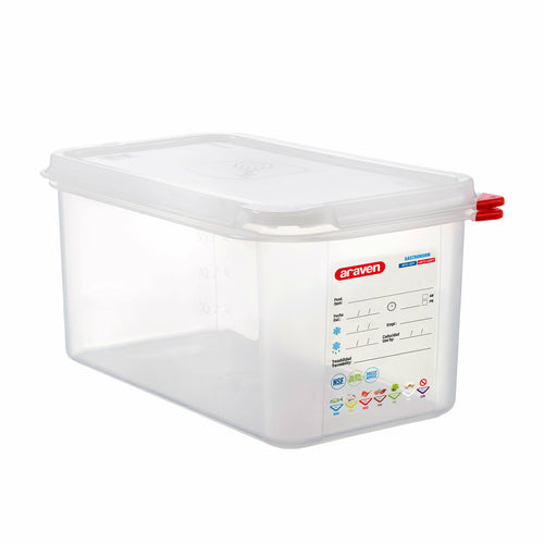 Araven Food Storage Container, 6.3 qt., 12-3/4" x 6-15/16" x 6", GN 1/3 size, Colorclip® coded, capacity indicators, permanent label, -40° F to 203° F temperature range, dishwasher safe, polypropylene, transparent, includes airtight polyethylene lid, NSF, HACCP compliant, BPA Free