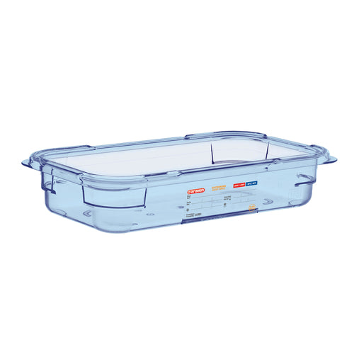Araven Food Pan, 2.48 qt., 12-3/4" x 6-15/16" x 2-1/2", GN 1/3, without lid, airtight, permanent label, measuring scale markings, ergonomic, temperature range: -40°F to 194°F (-40°C to 90°C), dishwasher safe, ABS, BPA free, transparent clear blue, NSF