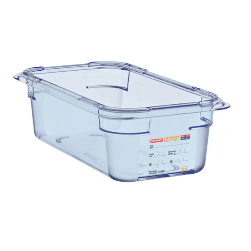 Araven Food Pan, 3.9 qt., 12-3/4" x 6-15/16" x 4", GN 1/3, without lid, airtight, permanent label, measuring scale markings, ergonomic, temperature range: -40°F to 194°F (-40°C to 90°C), dishwasher safe, ABS, BPA free, transparent clear blue, NSF