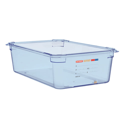 Araven Food Pan, 20.7 qt., 20-7/8" x 12-3/4" x 6", GN 1/1, without lid, airtight, permanent label, measuring scale markings, ergonomic, temperature range: -40°F to 194°F (-40°C to 90°C), dishwasher safe, ABS, BPA free, transparent clear blue, NSF