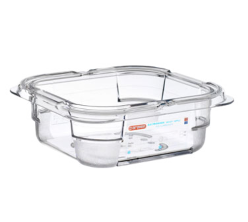 Araven Food Pan, 1 qt., 6-15/16" x 6-3/8" x 2-1/2", GN 1/6 size, stackable, break/stain-resistant, capacity indicators, permanent label, -40° F to 210° F temperature range, dishwasher safe, polycarbonate, clear, NSF, one container can be used to cover another, HACCP compliant