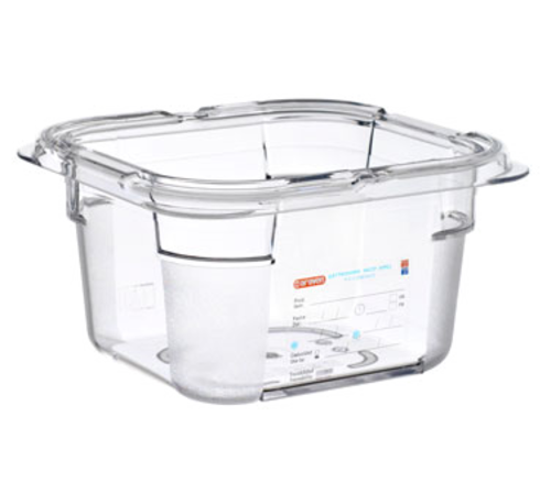 Araven Food Pan, 1.5 qt., 6-15/16" x 6-3/8" x 4", GN 1/6 size, stackable, break/stain-resistant, capacity indicators, permanent label, -40° F to 210° F temperature range, dishwasher safe, polycarbonate, clear, NSF, one container can be used to cover another, HACCP compliant