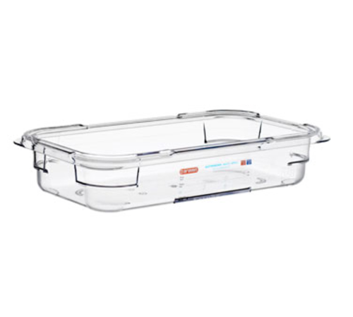 Araven Food Pan, 2.5 qt., 12-3/4" X 6-15/16" X 2-1/2", GN 1/3 size, stackable, break/stain-resistant, capacity indicators, permanent label, -40° F to 210° F temperature range, dishwasher safe, polycarbonate, clear, NSF, one container can be used to cover another, HACCP compliant