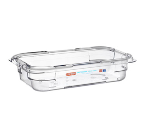 Araven Food Pan, 1.7 qt., 10-7/16" X 6-3/8" X 2-1/2", GN 1/4 size, stackable, break/stain-resistant, capacity indicators, permanent label, -40° F to 210° F temperature range, dishwasher safe, polycarbonate, clear, NSF, one container can be used to cover another, HACCP compliant