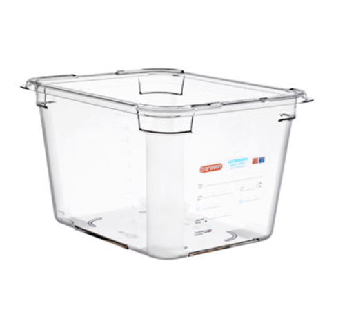 Araven Food Pan, 12 qt., 12-3/4" x 10-7/16" x 8", GN 1/2 size, stackable, break/stain-resistant, capacity indicators, permanent label, -40° F to 210° F temperature range, dishwasher safe, polycarbonate, clear, NSF, one container can be used to cover another, HACCP compliant