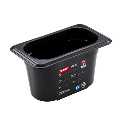 Araven Food Pan, 1.1 qt., 4"H, GN 1/9, airtight, ergonomic rim, permanent label, temperature range: -40°F to 176°F (-40°C to 80°C), dishwasher safe, BPA free, ABS, black, NSF