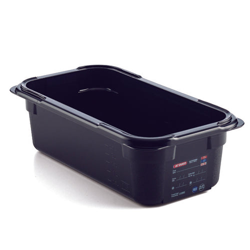Araven Food Pan, 3.9 qt., 12-3/4" x 6-15/16" x 4", GN 1/3, airtight, ergonomic rim, permanent label, temperature range -40°F to 176°F (-40°C to 80°C), dishwasher safe, BPA free, ABS, black, NSF