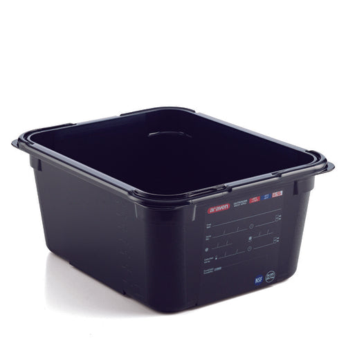 Araven Food Pan, 9.5 qt., 12-3/4" x 10-7/16" x 6", GN 1/2, airtight, ergonomic rim, permanent label, temperature range -40°F to 176°F (-40°C to 80°C), dishwasher safe, BPA free, ABS, black, NSF