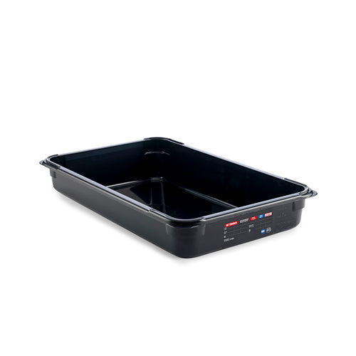 Araven Food Pan, 8.8 qt., 20-7/8" x 12-3/4" x 2-1/2", GN 1/1, airtight, ergonomic rim, permanent label, temperature range: -40°F to 176°F (-40°C to 80°C), dishwasher safe, BPA free, ABS, black, NSF