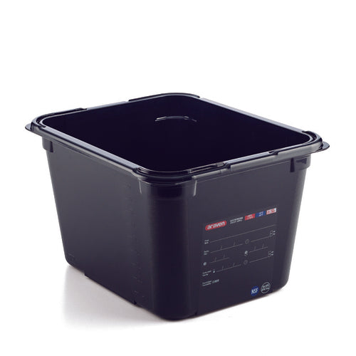 Araven Food Pan, 12 qt., 12-3/4" x 10-7/16" x 8", GN 1/2, airtight, ergonomic rim, permanent label, temperature range -40°F to 176°F (-40°C to 80°C), dishwasher safe, BPA free, ABS, black, NSF