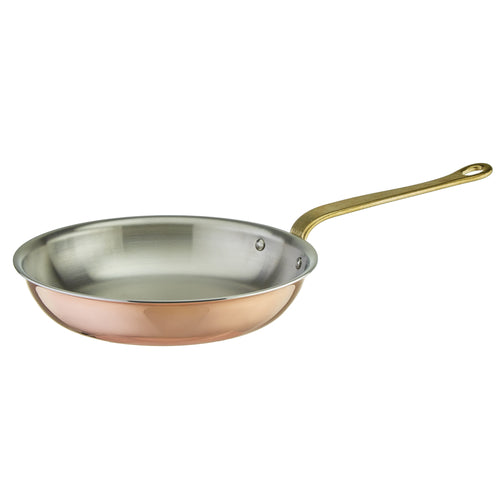 Fry Pan, 8-1/4" dia. x 1-3/4"H, 3-ply, copper, aluminum and 18/10 stainless steel construction, riveted solid brass handle, induction ready, safe for: gas/electric/radiant heat sources (hand wash only), Paderno, Copper Series 15500 (Special Order Item)