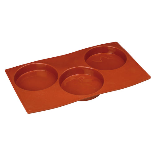 Mold, biscuit, 4.75 oz., (3) 4" dia. x 3/4"H molds, 11-7/8"L x 6-7/8"W O.A., flexible, temperature resistance -40° F to 500° F, reusable, non-stick, silicone, red, Paderno, Bakeware (Special Order Item)