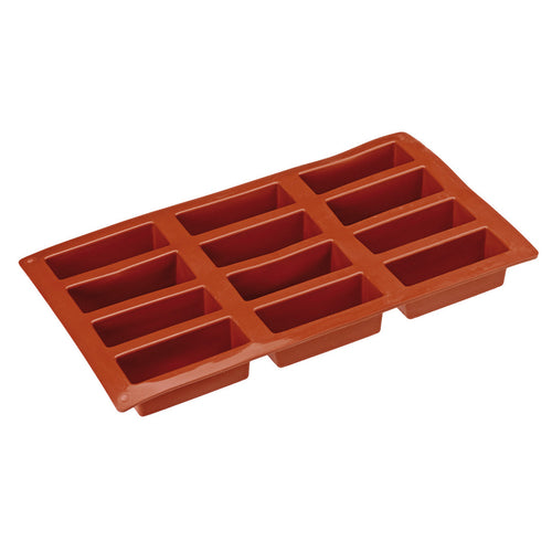 Mold, rectangular, 1.88 oz., (12) 1-1/8"W x 3-1/8"L x 1-1/8"H molds, 11-7/8"L x 6-7/8"W O.A., flexible, temperature resistance -40° F to 500° F, reusable, non-stick, silicone, red, Paderno, Bakeware