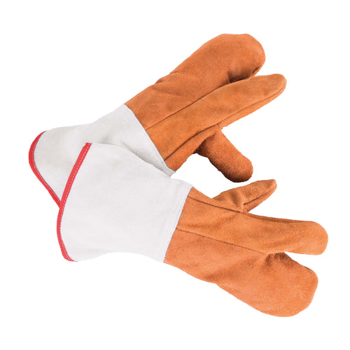 Oven Mitt, 14"L x 5-1/4"W, three fingers, protects up to 680° F, flexible, pair, leather, white & orange, Paderno, Baking Pans & Co (Special Order Item)