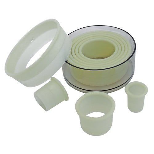 Pastry Cutter Set, round, 9-piece, with container (4" x 1-3/8"), heat resistant up to 320°, cutter sizes: 7/8", 1-1/8", 1-1/2", 2", 2-3/8", 2-3/4", 3-1/8", 3-1/2" and 4", nylon, Paderno, Bakeware