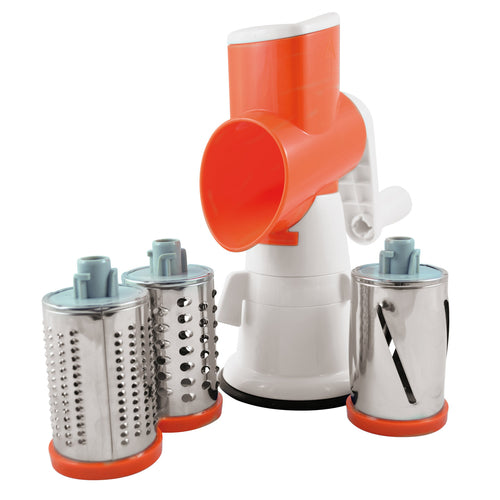 Swift Drum Grater, 11"H, manual, locking suction base, includes three stainless steel drum: fine drum (1/8" opening), coarse drum (1/4" opening), and slicer (2-3/4"L x 3/16" opening), dishwasher safe and heat resistant up to 150°F, constructed on ABS plastic, Paderno, Tools & Utensils, BPA free (discontinued, contact factory for availability)