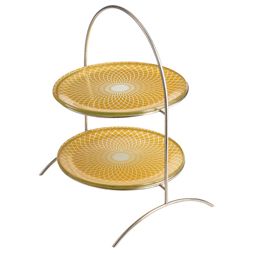 Display Stand, 2-tiered, 15.4" x 12.8" x 21.7"H, round, includes (2) Spiro gold round glass serving bowl, integrates with all Rosseto Skycap® and Multi-Chef™ Systems, dishwasher safe, microwave safe, cadmium and lead free, stainless steel, silver
