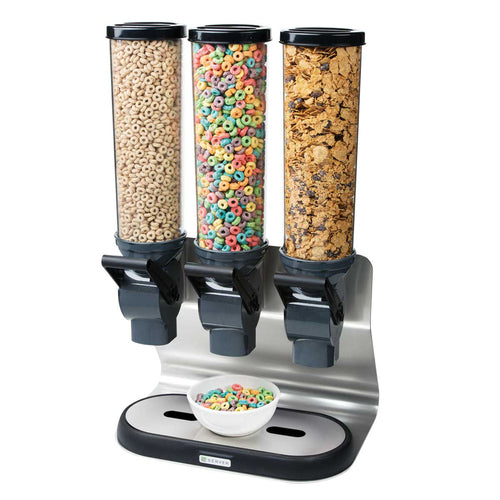 DFD-C, CEREALSERV™ DRY CEREAL DISPENSER, triple, countertop, (3) clear 3 L (101 oz.) hoppers display contents, dispenses a fixed portion of 2.2 oz., stainless steel stand, BPA free, ADA Compliant (does not require a twisting wrist motion or tight grasping to dispense), NSF