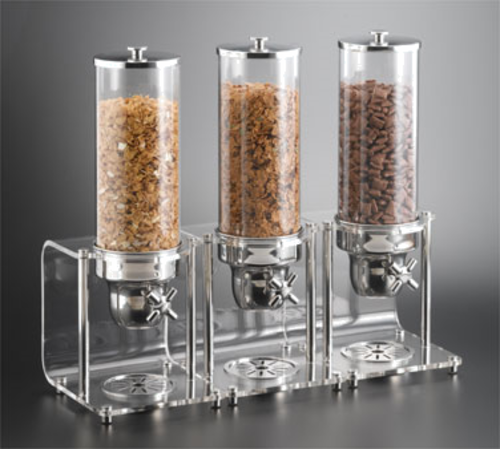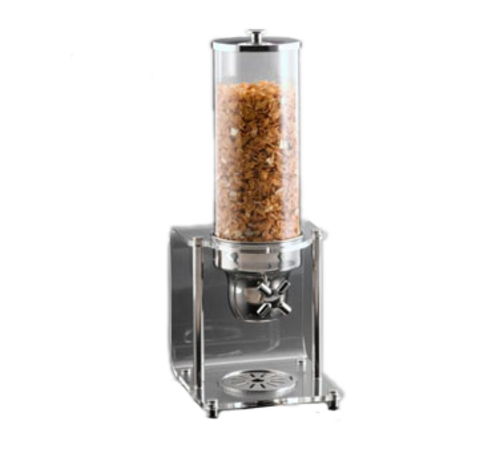 Hi-Line Cereal Dispenser, single, 15-3/5 cups (3.7 liter) capacity, 9"L x 8"D x 21-3/4"H, frosted acrylic base, (6) paddle compartment, acrylic canister, removable bottom catch tray, 18/10 stainless steel