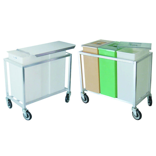 Kelmax Ingredient Bin, triple tub, (36) gallon capacity (12 gallon per tub), all welded aluminum frame, polyethylene containers (blue, white & yellow), (3) clear plastic lids, 5" poly U swivel stem casters, NSF