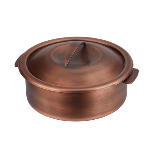 Servella Buffet Server, 4 qt., 10-1/4" dia. x 3-3/4"H, round, includes: (1) removable 4 qt. insert, with handles & lift-off lid, interior water fill line, induction ready, stainless steel & copper plated with aged finish