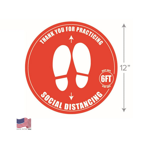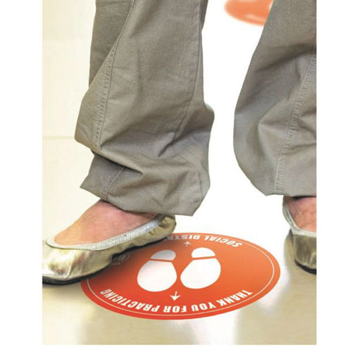 Floor Decal, "thank you for practicing social distancing", 12" dia., round, durable & long lasting, non-slip, residue-free, suitable for tile, laminate, concrete & wood, .20 thick, vinyl, bright orange with white imprint, UL410 compliant, Made in USA (1 label per sheet, 200 sheets per pack)