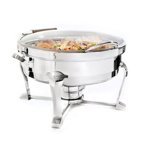 Chafer, 2 gallon, round, uses fuel heat, hinged glass cover stops in any position, with food pan, all welded, condensation retrieval system, induction ready, stainless steel, DW Haber, Millennium (minimum = case quantity) (non-stock item)