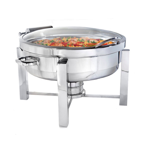Chafer, 2 gallon, round, uses fuel heat, hinged glass cover stops in any position, with food pan, all welded, condensation retrieval, induction ready, stainless steel, DW Haber, Tower (minimum = case quantity) (non-stock item)