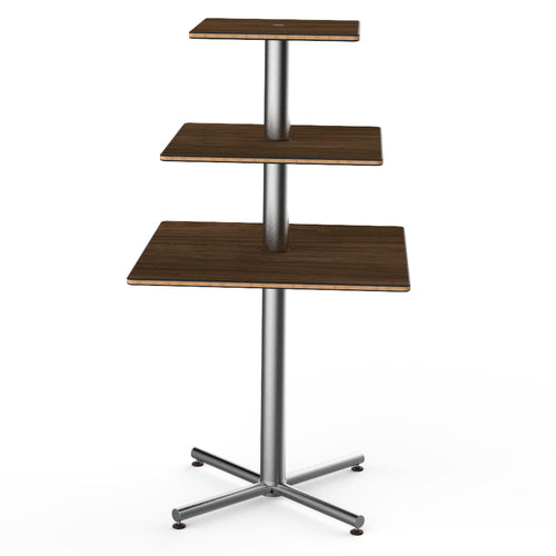 Mogogo Buffet Solutions Polo Display Table, 3-tier, 30" x 30" x 55"H, square, Bengali mango wood BHP high pressure laminate with bamboo core top, brushed stainless steel segments, knockdown