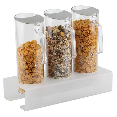Cereal Bar Set, 7-piece, 101-1/2 oz. per pitcher, 15"L x 6-3/4"W x 16-3/4"H, includes: (3) clear acrylic pitchers with stainless steel flap lids, (3) air tight covers, & (1) frosted acrylic stand, APS® Germany (1 each per case)