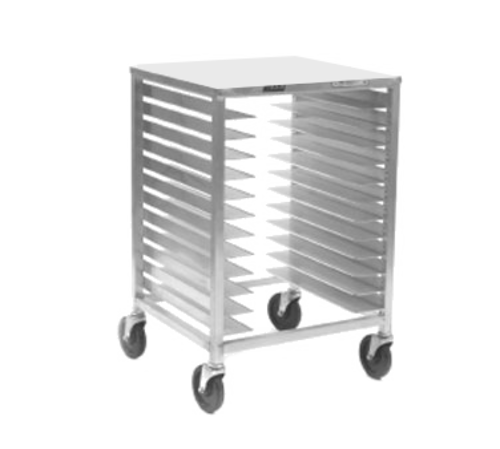 Panco® Pizza Pan Rack, Mobile, counter height, open sides, with slides for (13) round or square pizza pans, slides on 2" centers, adjustable extruded aluminum frame, front loading, 5" casters