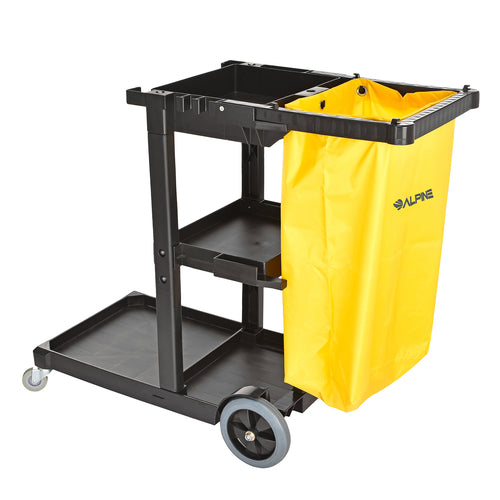Janitorial Cleaning Cart, 18-7/8" x 39-3/16" x 47-5/8"H, (3) sturdy shelves, (1) mop & broom holder, 18-1/2 gallon vinyl bag, front platform, folding handle for storage, non-marking wheels, plastic/PVC/metal/Oxford cloth, gray