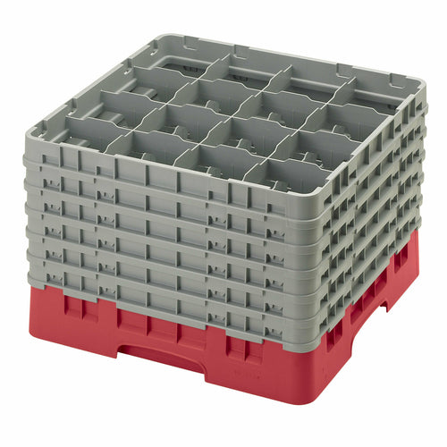 Camrack® Glass Rack, with (6) soft gray extenders, full size, 19-3/4" x 19-3/4" x 13-3/4", (16) compartments, 4-3/8" max. dia., 12-5/8" max. height, red, HACCP compliant, NSF