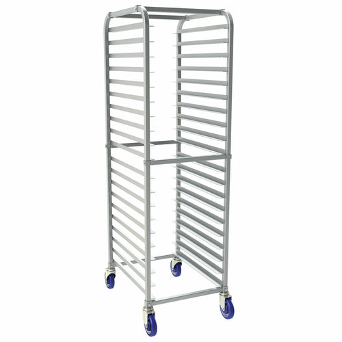 Sheet Pan Rack, 69"H, full size, end load, (20) 18" x 26" pan capacity, 3" spacing, open top, open sides, aluminum construction, (4) 5" polyurethane swivel casters, NSF (ships knocked down)