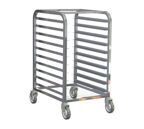 Sheet Pan Rack, 38"H, half size, end load, (6) 18" x 26" pan capacity, 5" spacing, open top, open sides, fully welded aluminum construction, (4) 5" polyurethane swivel casters, NSF, Made in USA