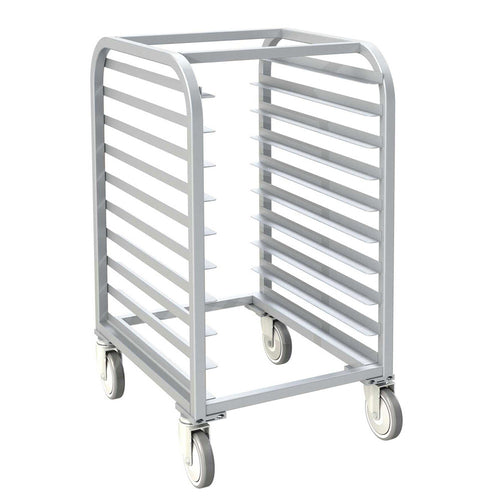 Sheet Pan Rack, 32"H,under shelf half size, end load, (8) 18" x 26" pan capacity, 3" spacing, open top, open sides, fully welded aluminum construction, (4) 5" polyurethane swivel casters, NSF, Made in USA