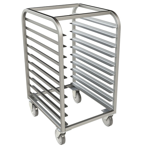 Sheet Pan Rack, 38"H, half size, end load, (5) 18" x 26" pan capacity, 6" spacing, open top, open sides, fully welded stainless steel construction, (4) 5" polyurethane swivel casters, NSF, Made in USA