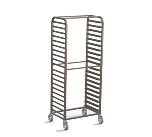 Sheet Pan Rack, 70-1/2"H, full size, side load, (15) 18" x 26" pan capacity, 4" spacing, open top, open sides, fully welded stainless steel construction, (4) 5" polyurethane swivel casters, NSF, Made in USA