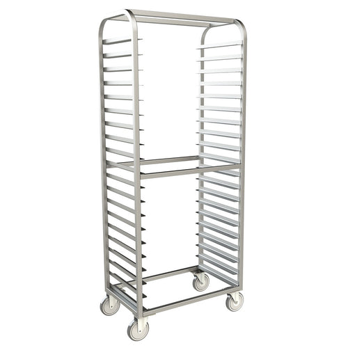 Sheet Pan Rack, 64"H, refrigerator size, side load, (18) 18" x 26" pan capacity, 3" spacing, open top, open sides, fully welded stainless steel construction, (4) 5" polyurethane swivel casters, NSF, Made in USA