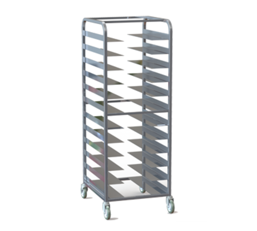 Oval Tray Rack, 69"H, (12) pan/tray capacity, compatible with 18" x 26", 12" x 20", and up to 23" oval trays including 22" x 27, 23" x 31", 19-1/2" x 24" and 19" x 23", 5" spacing, (4) all swivel 5" polyurethane casters with full thread guard, fully welded aluminum construction, NSF, Made in USA