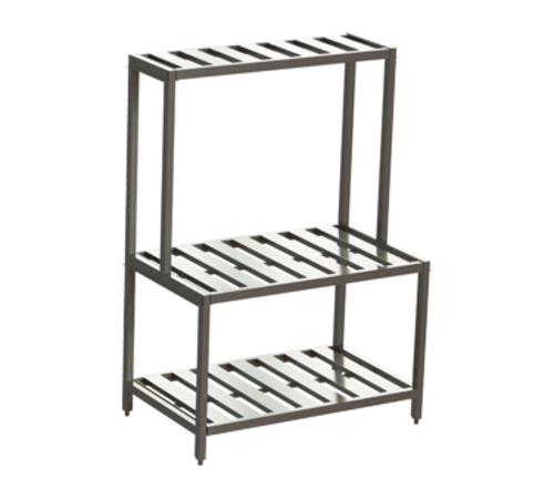 Modular Keg Rack, base unit, 55"W x 17"D x 78"H, (6) keg capacity, (3) channel shelves, (2) 17"D x 52"W shelves (bottom shelf 8" off the floor), top shelf for storage, rear protective strap, adjustable flanged feet, fully welded aluminum construction, NSF