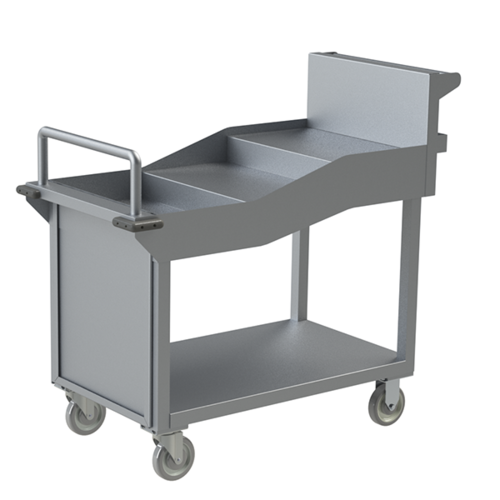 Picking Cart, 46" x 21" x 36"H, with (2) handles, (3) step down shelves on top for easy order fulfillment, (1) solid bottom flat shelf, with bag hooks & sign holder, (4) 5" center casters (2 rigid, 2 swivel), fully welded aluminum construction, NSF, Made in USA