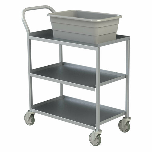 Utility Cart, open base, (3) solid aluminum shelves, with reinforced lip design (three edges up, one edge down), shelf size: 32"W x 18"D, push handle, (4) 5" all swivel poly-U casters, fully welded aluminum construction, NSF, Made in USA