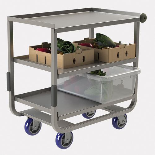 Utility Cart, open base, (2) solid 16 gauge stainless steel shelves, with reinforced lip design (three edges up and one edge down), shelf size: 42"W x 21"D, Vertical and Handle Bumpers Standard, (4) 5" x 2" Heavy Duty poly-Urethane casters (2) rigid (2) Swivel with brake, full welded stainless steel construction, NSF, Made in USA